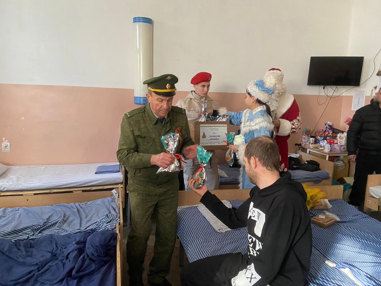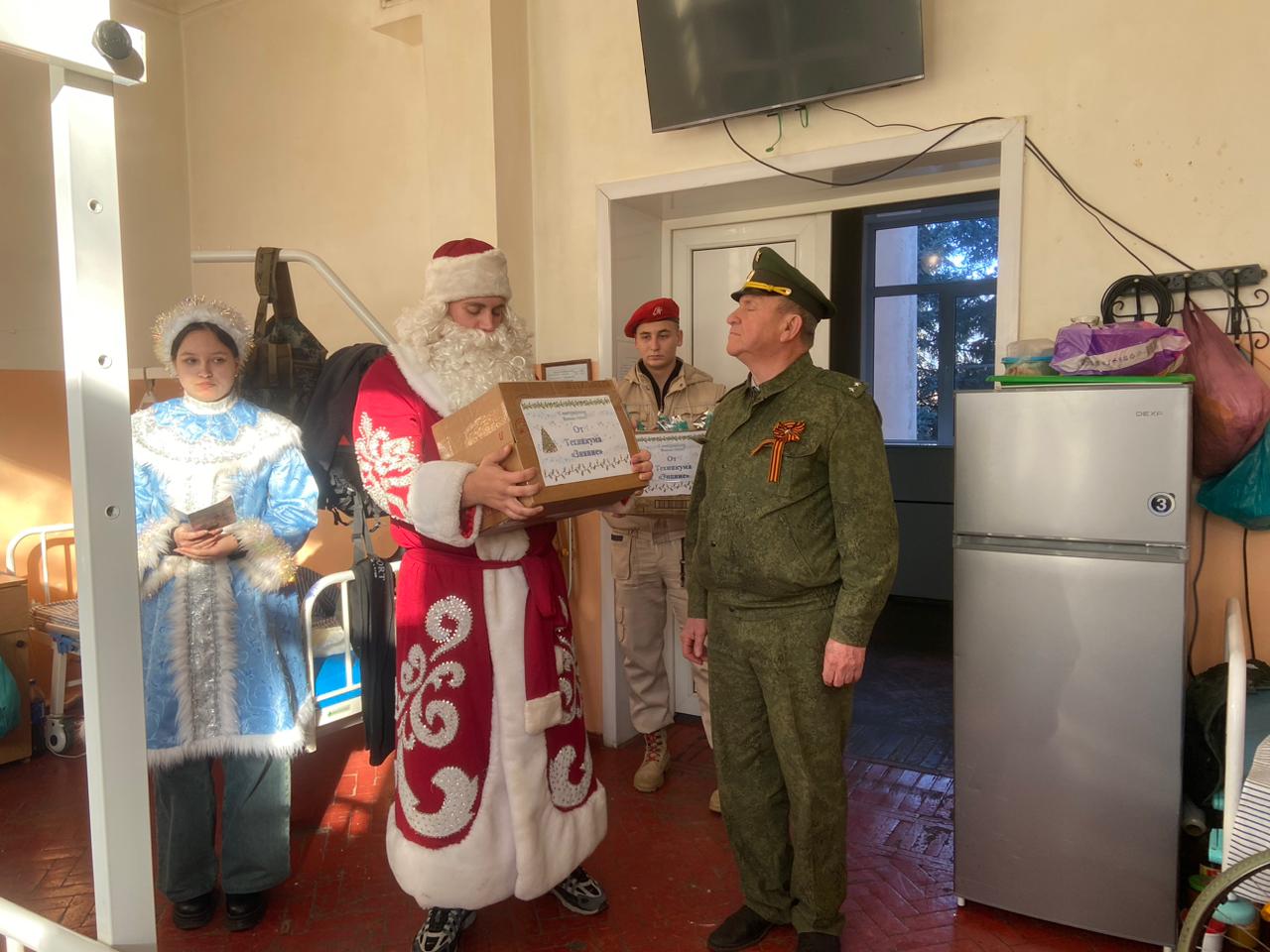 Гости позаботились о том, чтобы праздничное настроение пришло в каждую палату. Каждому бойцу был вручен вкусный конфетный подарок и ароматные мандарины — неизменные символы Нового года. Защитников Отечества также поздравили Дед Мороз и Снегурочка.