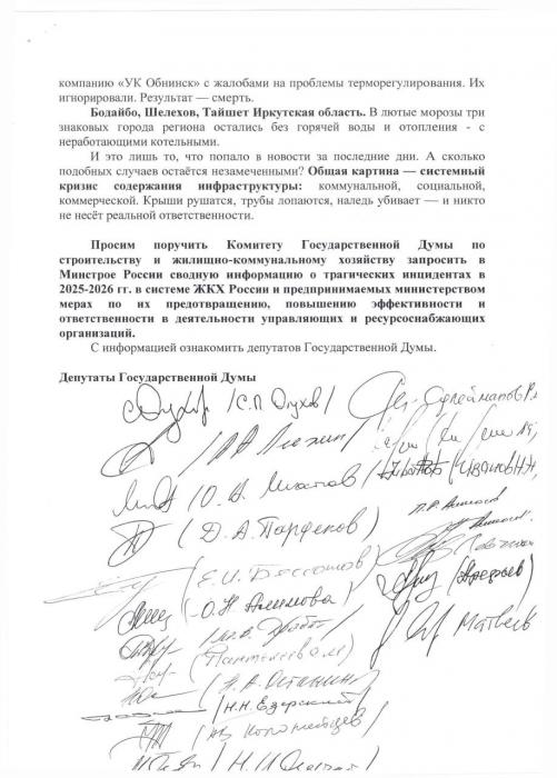 Проект был адресован Палате в целом и содержал вполне конкретное и элементарное требование: «Поручить Комитету Государственной Думы по строительству и жилищно‑коммунальному хозяйству запросить в Минстрое России сводную информацию о трагических инцидентах в 2025–2026 гг. в системе ЖКХ России и предпринимаемых министерством мерах по их предотвращению, повышению эффективности и ответственности в деятельности управляющих и ресурсоснабжающих организаций. С информацией ознакомить депутатов Государственной Думы».