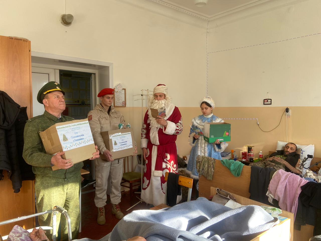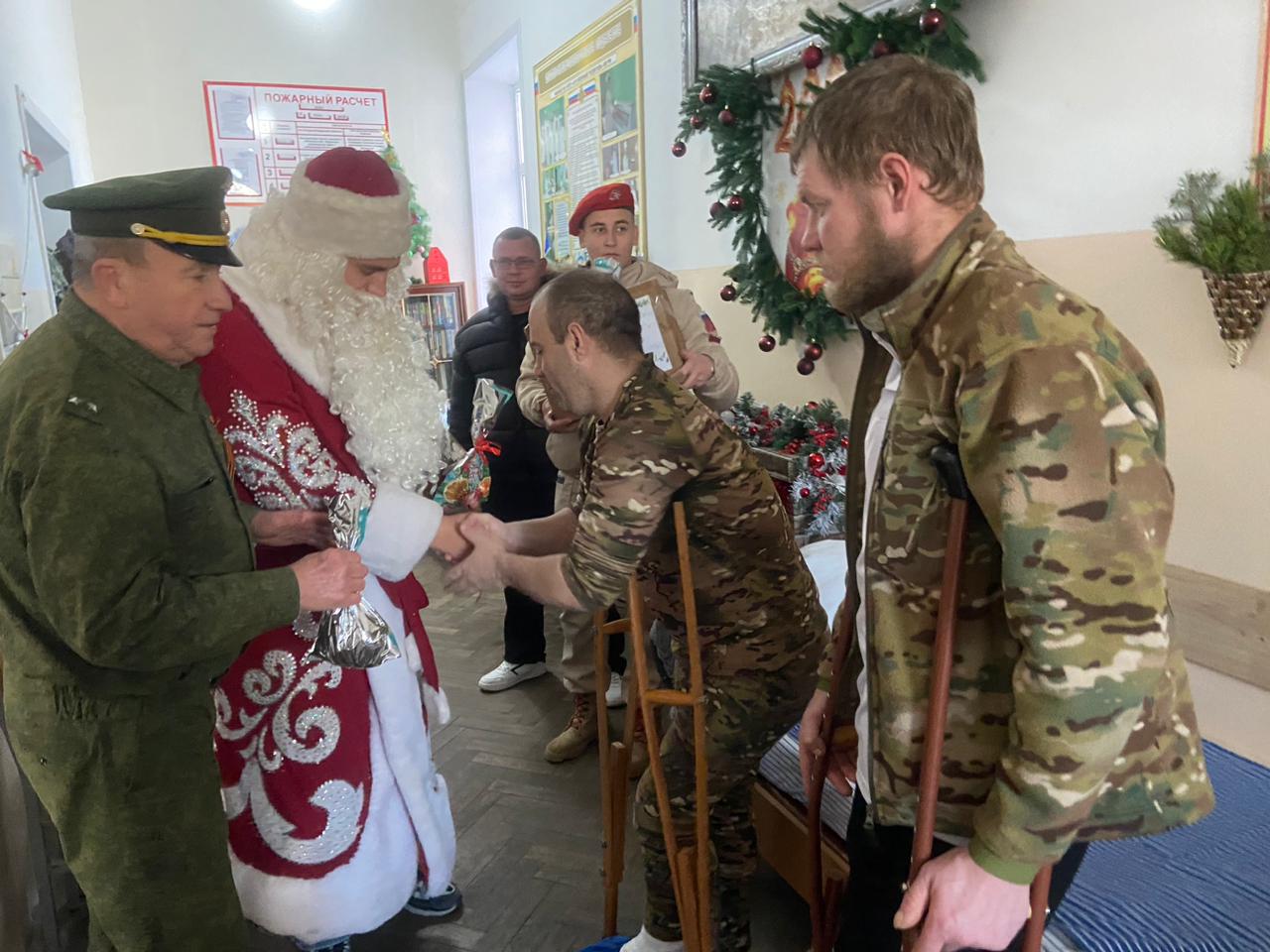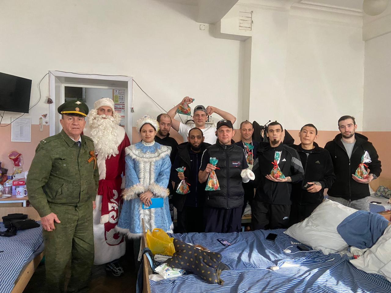Гости позаботились о том, чтобы праздничное настроение пришло в каждую палату. Каждому бойцу был вручен вкусный конфетный подарок и ароматные мандарины — неизменные символы Нового года. Защитников Отечества также поздравили Дед Мороз и Снегурочка.