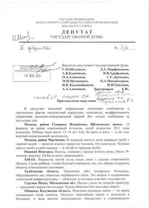 Проект был адресован Палате в целом и содержал вполне конкретное и элементарное требование: «Поручить Комитету Государственной Думы по строительству и жилищно‑коммунальному хозяйству запросить в Минстрое России сводную информацию о трагических инцидентах в 2025–2026 гг. в системе ЖКХ России и предпринимаемых министерством мерах по их предотвращению, повышению эффективности и ответственности в деятельности управляющих и ресурсоснабжающих организаций. С информацией ознакомить депутатов Государственной Думы».