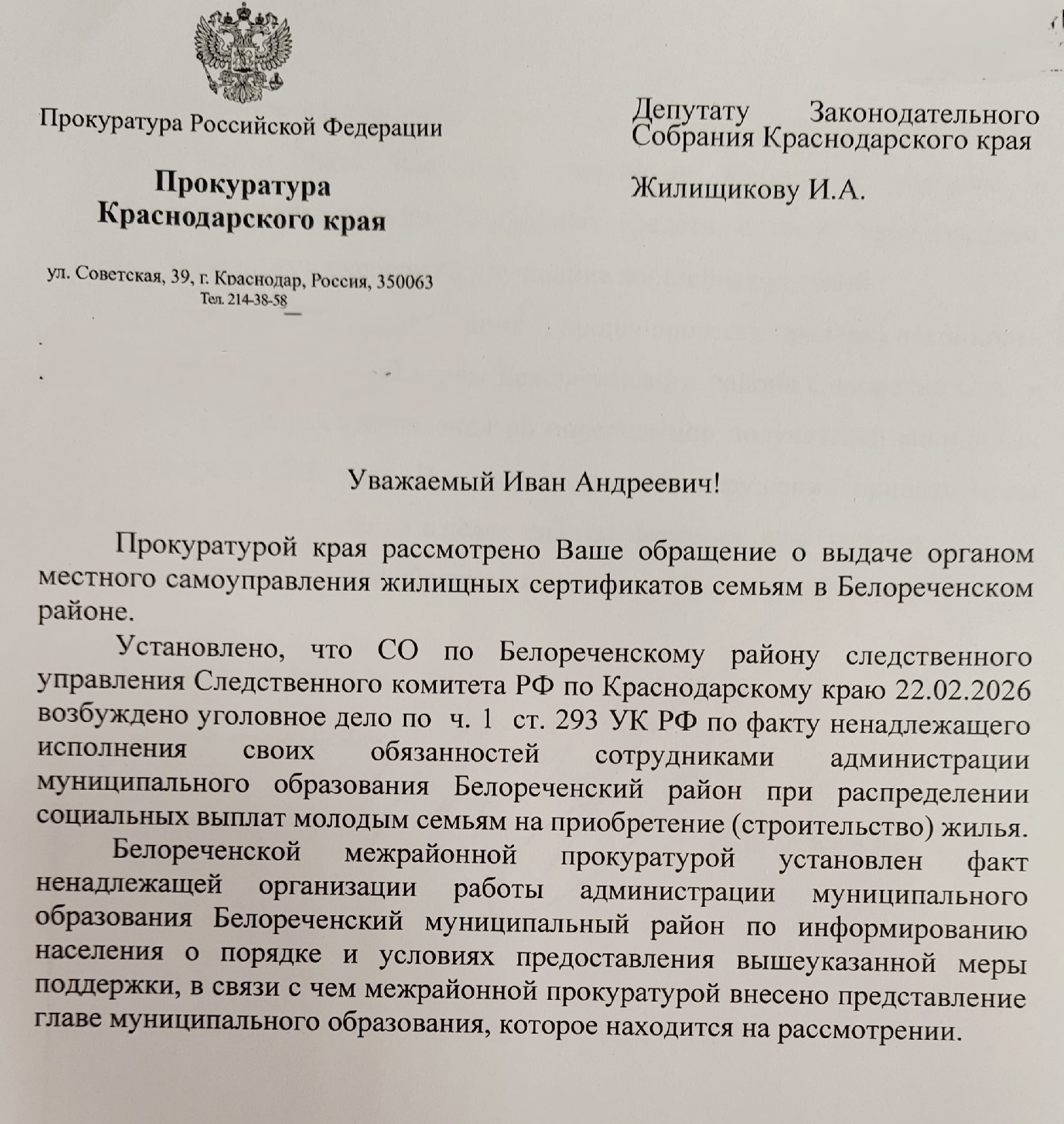Иван Жилищиков направил обращение в краевую прокуратуру – с просьбой провести тщательную проверку законности и обоснованности решений, принятых главой Белореченского района и органами местного самоуправления.
